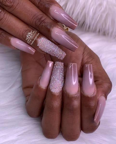 Luce elegante y bonita en el baile de graduación con estas uñas desnudas. Esta manicura linda y con clase tiene un suave color desnudo y un atrevido brillo. El brillo en este diseño de uñas varía en color desde plateado a ciruela y un brillo gradiente que combina los dos. Este es un look tan glamoroso para el baile de graduación.