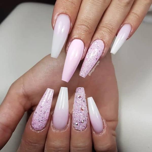 Si estás buscando ideas perfectas para las uñas del baile de graduación, ¡esta manicura lo tiene todo! Presenta uñas de color rosa a blanco con una sola uña de color rosa sólido y cuentas de purpurina que detallan las otras. Esta manicura inspirada en la princesa es tan chic y elegante y perfecta para la noche del baile! Esta manicura hará que todos giren la cabeza hacia ti.