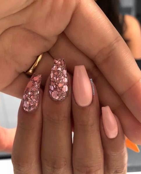 Esta manicura rosa de Barbie es tan popular ahora mismo y es fácil ver por qué. Es un color que combina esencialmente con cualquier ropa y no es muy ruidoso. Los sutiles colores de rosa claro y un suave acento de brillo plateado es la combinación perfecta. Las alargadas puntas de almendra de esta hermosa manicura son elegantes y están a punto para el baile de graduación.