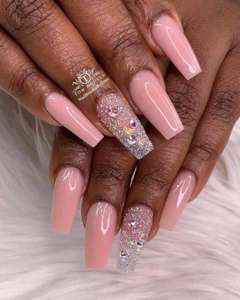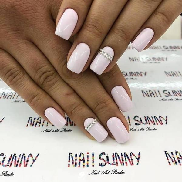 La noche del baile de graduación puede ser tan cuidadosamente pensada como una boda para algunas chicas. Esta simple manicura inspirada en la novia es un look perfecto para las uñas del baile. El color de gel rosa suave de las uñas es sutil, pero cuando se combina con una tira de diamantes de imitación plateados para acentuar, mejora el ambiente elegante que toda chica quiere para el baile de graduación.