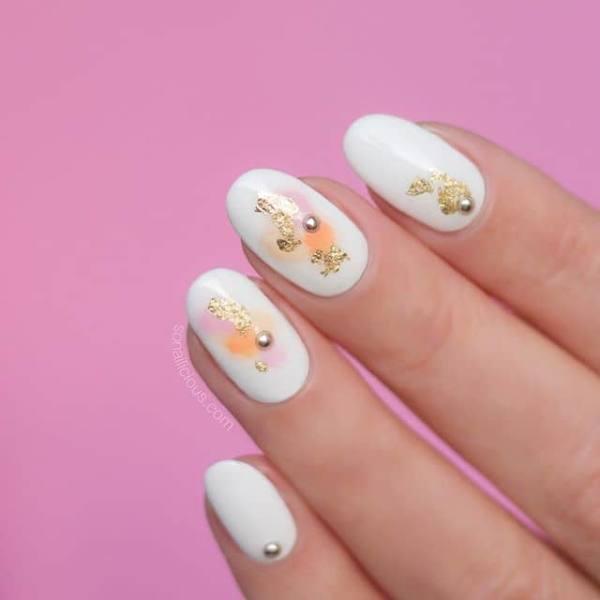 ¿Quieres una manicura única y con estilo para el baile de graduación que nadie más tendrá? Esta manicura tiene una base de pulido blanco sólido con toques de rosa y naranja. El arte de las uñas de lámina dorada resalta el glamour de esta manicura tan básica. También me encantan los tacos esporádicos colocados estratégicamente en cada uña.