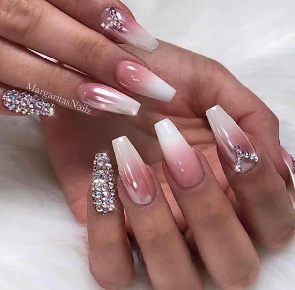 ¿Buscas una manicura hermosa y elegante para la noche del baile? Esta impresionante manicura tiene uñas largas de coffin con un efecto de gradiente de rosa a blanco. Las gemas de estrás que cubren completamente la uña meñique son tan lujosas y elegantes que la convierten en una manicura perfecta para la gran noche. Sus uñas estarán brillantes y lustrosas toda la noche con este look.