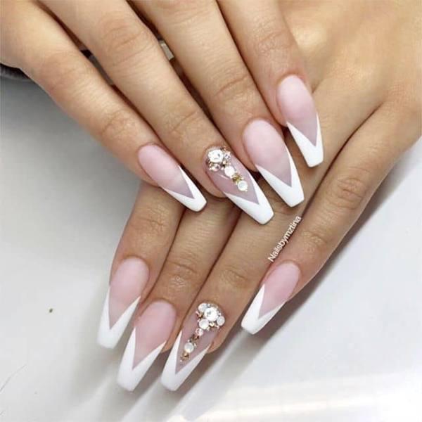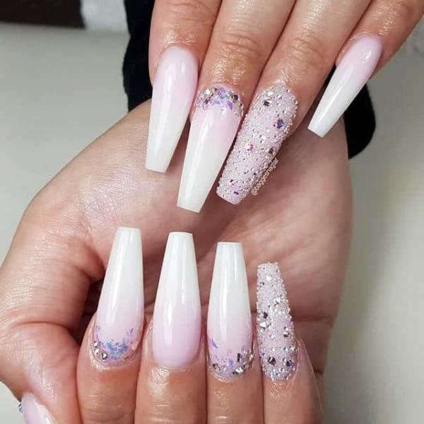 Esta manicura de ensueño es tan delicada y elegante. Es simple, pero impresionante, con puntas de coffin blancos y claros con el diseño de brillo francés invertido y adornos completos como acentos. Las uñas de acento comenzaron originalmente con sólo las uñas anulares acentuadas, pero con el tiempo los estilistas han estado mezclando y combinando qué uñas son aceptadas para un aspecto único y personalizado.