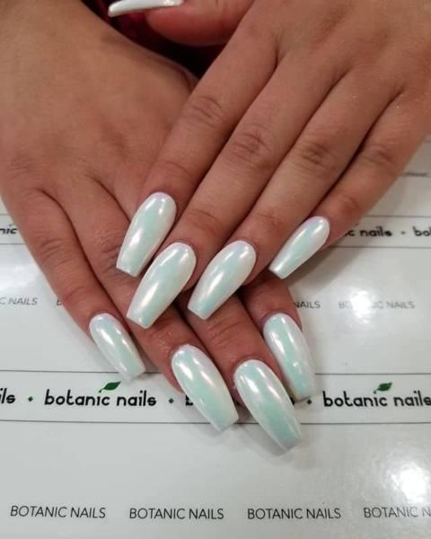 Hay algo en estos blancos nacarados, y no estoy hablando de tus dientes. ¡Estas uñas blancas nacaradas son la verdadera perfección! El largo estilo en forma de coffin llama la atención y llama tu atención. El esmalte blanco nacarado de cromo realmente brilla con esta elegante manicura para el baile de graduación.