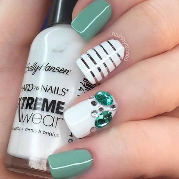 Una de las mejores maneras de expresar tu estilo personal en la noche del baile es a través de tus accesorios y esto incluye tus uñas. Esta manicura única tiene un bonito tono verde con esmalte blanco, rayas de plata y piedras esmeralda a juego. Esta es una manicura divertida que puedes recrear en casa con sólo unos pocos colores y materiales de decoración de uñas.