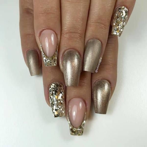 La próxima manicura es una declaración de oro. Si tu vestido tiene algo de oro, esta manicura será un éxito total. Estas largas uñas de coffin tienen un color sólido desnudo con brillo dorado y adornos en casi todas las uñas. Puedes probar este mismo concepto con diferentes colores para que la manicura pueda combinar con cualquier vestido que elijas.