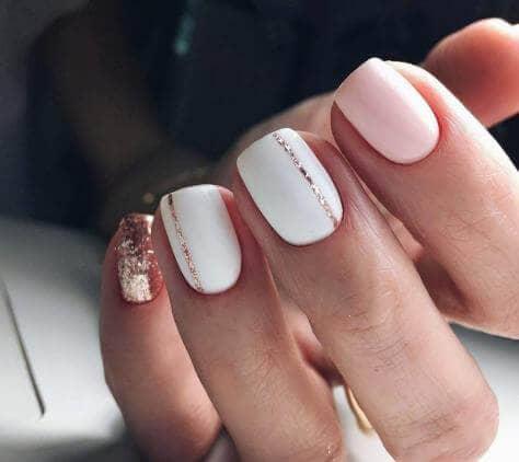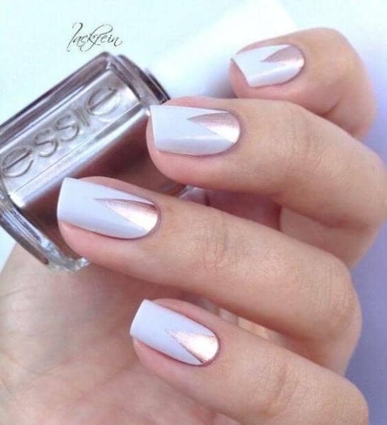 Las uñas blancas mate siempre son bonitas y de aspecto dulce, pero es el lindo chevrón dorado en la uña de acento lo que hace que este diseño de uñas pase de ser clásico a ser tan lindo como pueda serlo! Para el adicto a las uñas que no tiene tiempo para un juego completo de uñas con brillo, un simple acento puede ser suficiente para separar las uñas.
