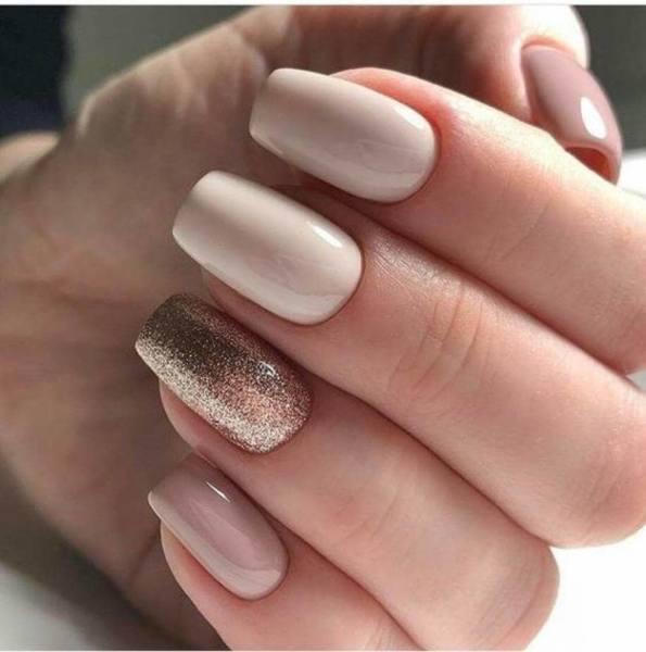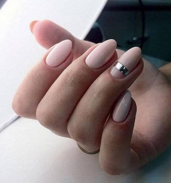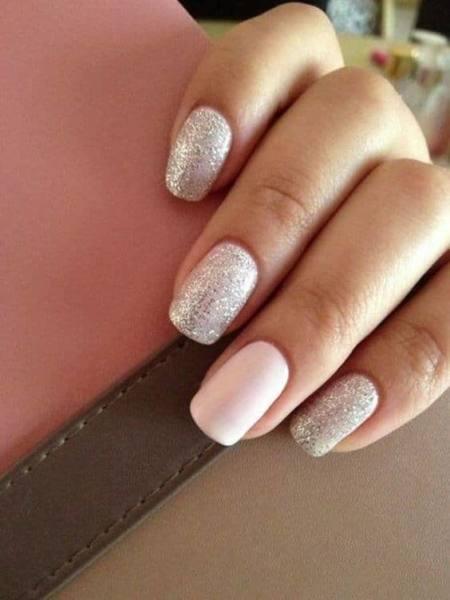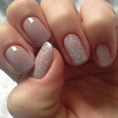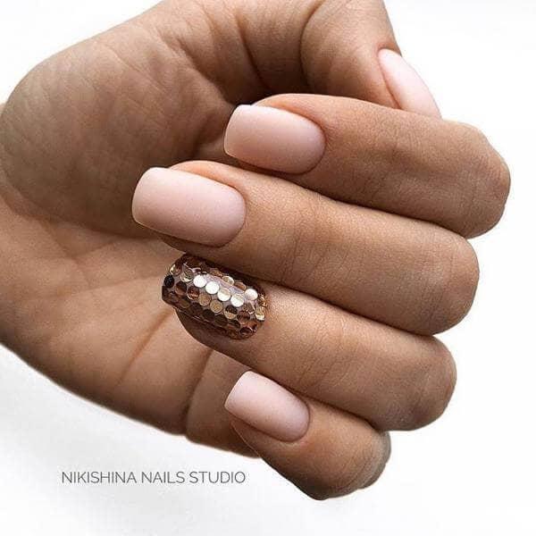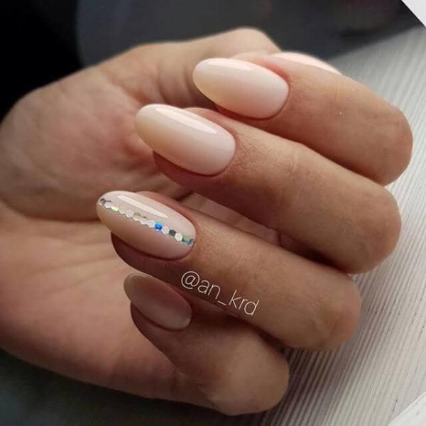 El primero de nuestros 30 diseños de uñas es este juego de uñas rosadas desnudas con un acento brillante para darle una pequeña patada. La simplicidad de las otras uñas se compensa con el brillo de la tercera uña, y el resultado final es tan lindo como llamativo.