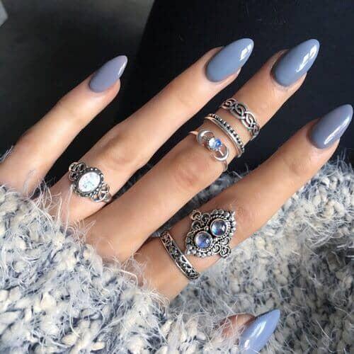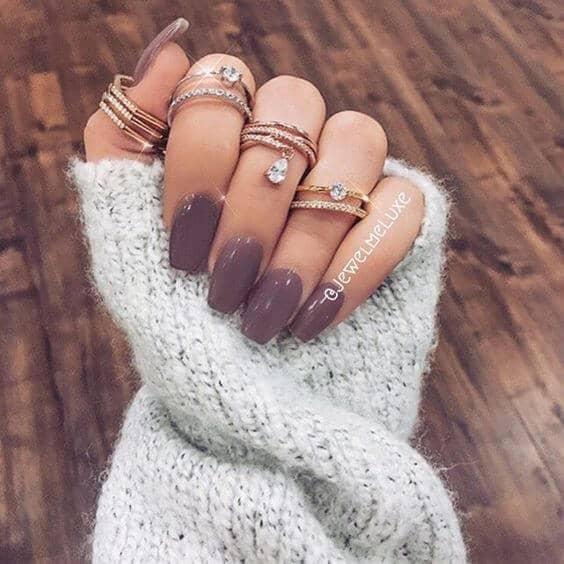 Para un look que es genial en todos los sentidos de la palabra, el color de las uñas que se muestra aquí da un aspecto tranquilo y recogido que se compensa con los anillos únicos para los dedos y el divertido suéter borroso. Demostrando que a veces el estilo más simple es el mejor, este diseño de uñas largas es lo suficientemente diferente para la diversión, pero lo suficientemente simple para ser intemporal.