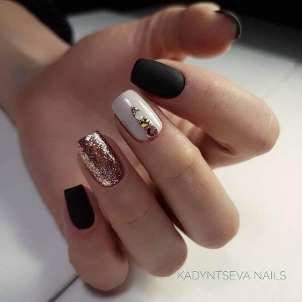 Con un toque de glamour de la vieja escuela para realzar el drama, estas uñas negras y doradas utilizan pintura mate blanca y negra, brillo de partículas grandes, cristales transparentes y brillo dorado fino para pintar un conjunto de colores, brillos y destellos que convierten este aspecto relativamente moderno de las uñas en un diseño verdaderamente clásico.