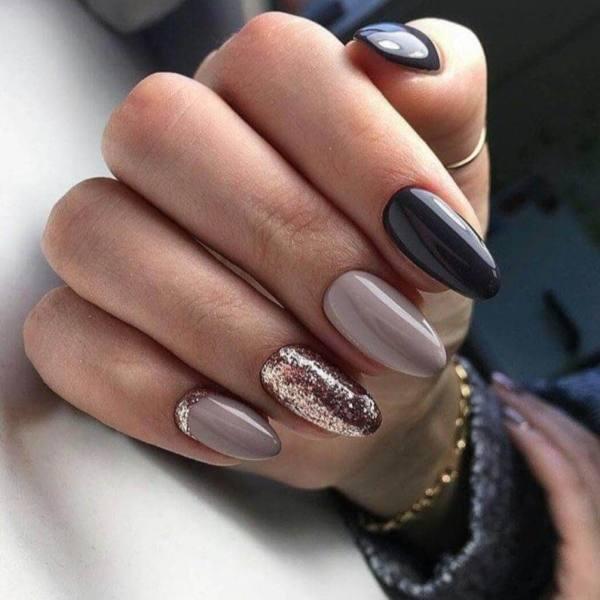 En lugar de las uñas negras y doradas lisas, estas uñas grises, doradas y brillantes juegan con diferentes texturas para crear un elegante conjunto de contrastes que funcionan maravillosamente juntos, a pesar de la diferente combinación de colores y estilos representados por las dos uñas de acento y las tres uñas restantes, que son lisas, limpias y de un tipo de gris mate.