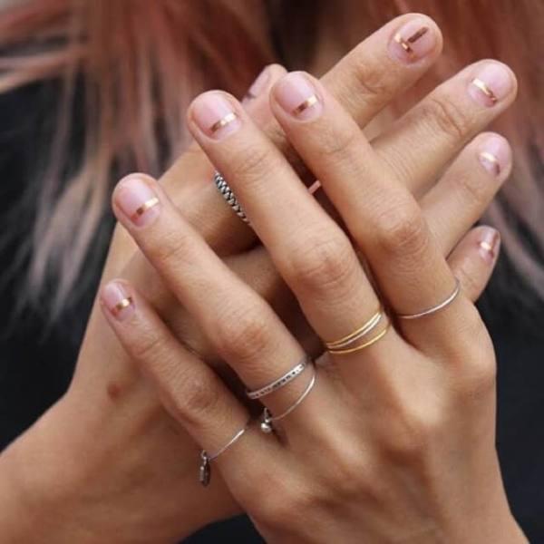 Como en el ejemplo anterior, estas puntas metálicas francesas son otro ejemplo de cómo se puede dar un giro moderno a las ideas clásicas sobre las uñas. Los sutiles destellos rosados de las uñas de color desnudo se recogen en el brillo dorado de los tips de manicura, y sólo unos pocos anillos de dedo lindos son suficientes para unir todo el look perfectamente.