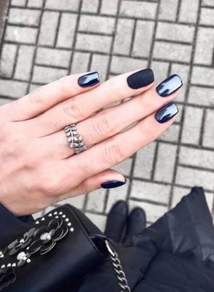 ¿Son negros? ¿Son azules? ¿Están en algún punto intermedio? ¡Con estas uñas cortas, el color no importa! Es el dramático contraste del color liso y atrevido con el intrincado diseño del único anillo del dedo corazón que combina tanto el negro como el azul marino en un despliegue perfecto de luz y oscuridad.