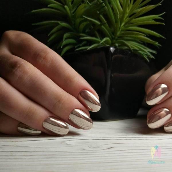 La asimetría siempre es atractiva, y los diseños de uñas como el que se muestra aquí dan una buena razón de por qué es así. El brillo de la uña con acento brasileño se hace eco en los cortes de la pintura de brillo metálico, y el color pálido y bonito desnudo de la capa base subyacente es suficiente para fijar ese brillo dorado a la perfección absoluta!