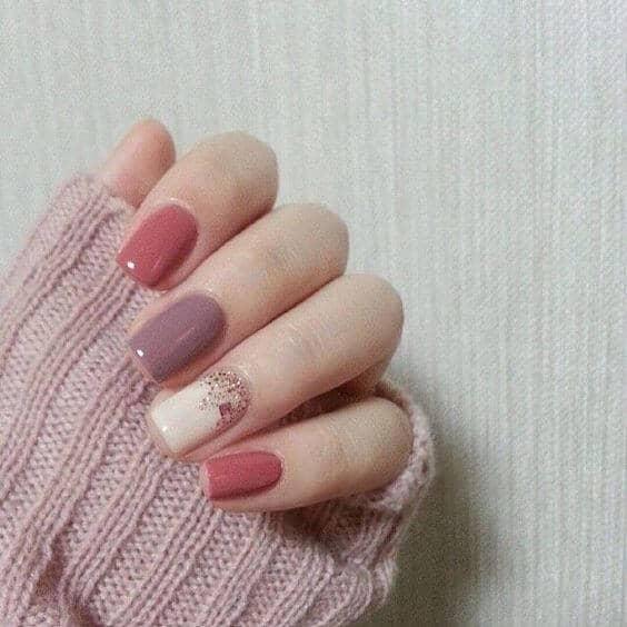 Combinando destellos dorados y rosados en las uñas desnudas, estas uñas de diseño son de diferentes colores, pero se combinan para hacer un conjunto de uñas bonitas y brillantes que no parecen desconectadas o aleatorias en absoluto. El brillo de la uña de acento une la mayoría de los colores, haciendo que este diseño de uña fácil parezca intrincado y detallado.