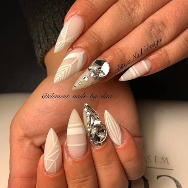 Vístete como la Reina de la Nieve para el próximo baile con estas hermosas uñas de carácter. El diseño del estilete está compensado con un pulido iridiscente complementado con piedras preciosas de colores coordinados en el primer y segundo dedos. Este parece un diseño que una novia hindú usaría para el día de su boda y es igualmente familiar en la cultura occidental también.