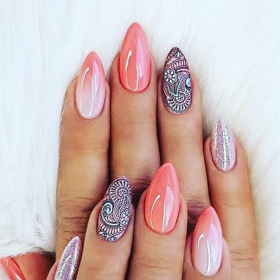Recubierto con una capa superior brillante y con ilustraciones detalladas de uñas selectas, este impresionante diseño de uñas en la cima de la montaña es perfecto y atractivo. La presencia de brillo iridiscente en los dedos meñiques añade un contraste con el patrón de cachemira delicadamente grabado y las ruborizadas uñas de color rosa en los otros dedos. Este es un buen look de verano para esos días calurosos y helados.