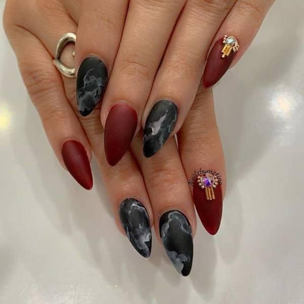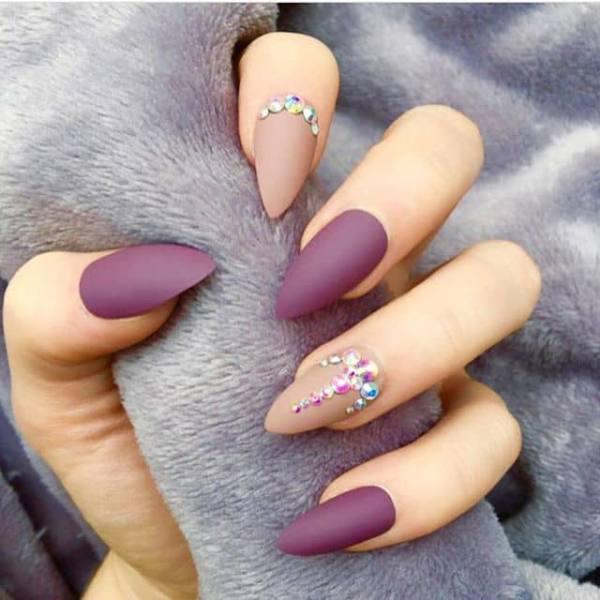 Estas uñas son sutiles pero convincentes con estrás colocados artísticamente en dedos alternos. El vino tinto y el acabado mate desnudo crean un aire de juego profesional. Las damas que buscan un poco de glamour para usar en el trabajo el lunes o que quieren asistir a un almuerzo tranquilo con sus amigas en un restaurante fino apreciarán este diseño de uñas con clase.