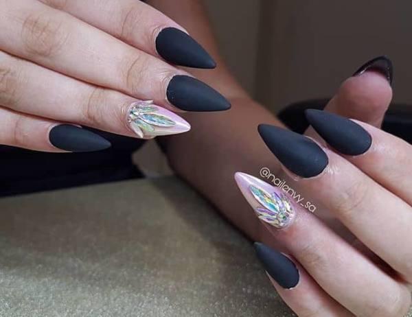 ¿Quién dijo que tenías que tener el mismo estilo de la uña en cada dedo de tus manos? Agitar un poco las cosas con un poco de mezcla y combinación. La clásica forma de uña de coffin (o bailarina) combinada con las uñas de tacón crea un aspecto atractivo que se realza con una banda de estrás en un dedo de cada mano. La combinación de negro mate y rosa francés suave crea un aspecto que es a la vez suave y puntiagudo.