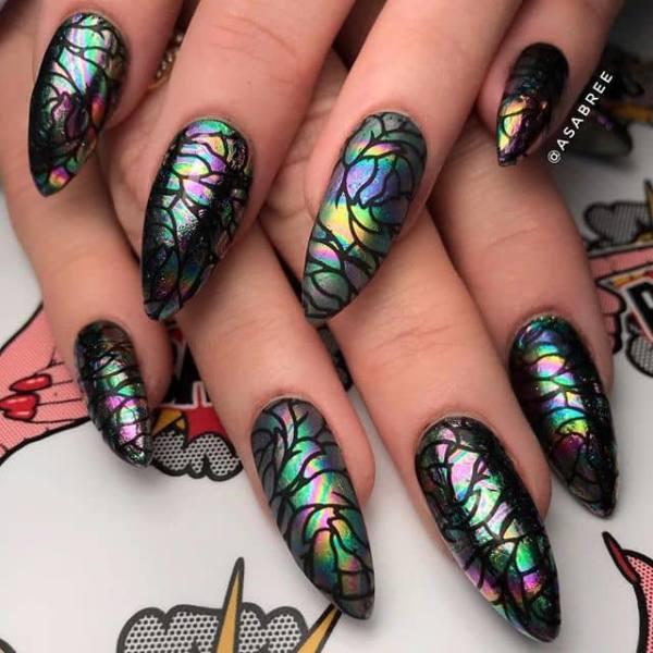 Es difícil decidirse… ¿se parece al Jardín del Edén con la luz del sol filtrándose a través de las hojas y ramas de los árboles, o se parece al interior de una iglesia con vitrales de arte? Cualquiera que sea el que escojas, es innegable que este estilo de uñas de almendra es algo que no encontrarás en la mayoría de los salones de uñas. Si tienes este diseño en tus manos, prepárate para escuchar los OMG y los cumplidos.