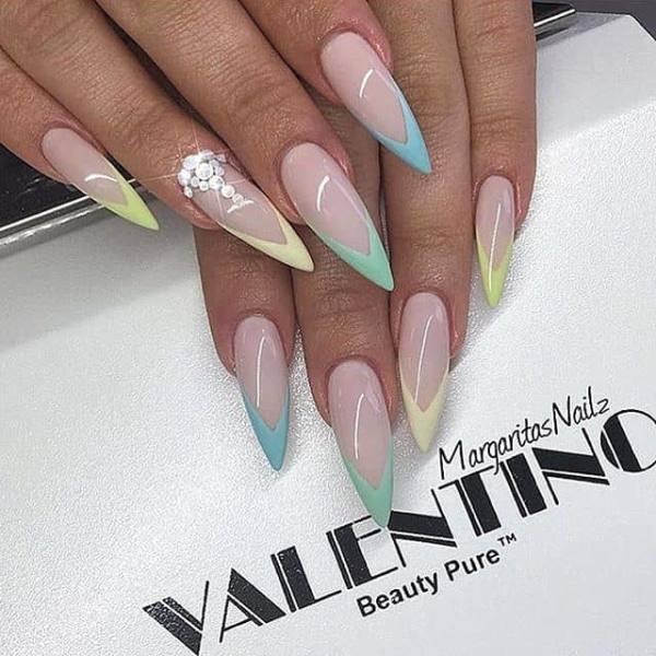 Los colores primaverales adornan las puntas de estas uñas de estilete que se pulen con un acabado acrílico. Un pequeño detalle de estrás en un solo dedo da un aire de rareza y gracia. Este es un gran look para aquellos a quienes les gustan los colores del mar y desean que las piedras preciosas les recuerden el valor de la vida. Probablemente encontrarás que este diseño atrae la atención de muchos con mucha gente preguntando dónde lo hiciste.