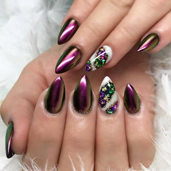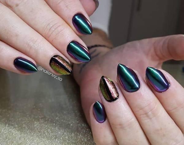 40. Hermosas uñas verdes láser con tintes de colibrí