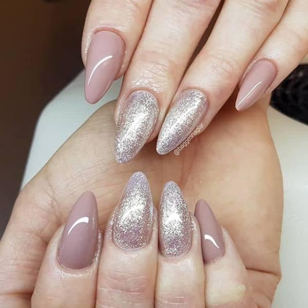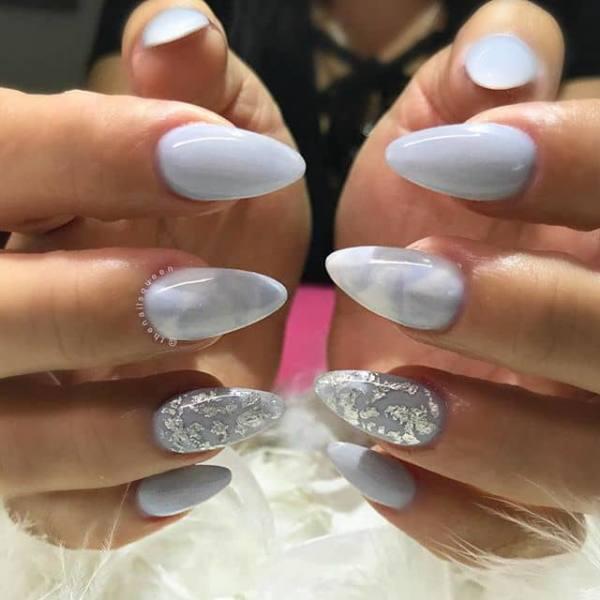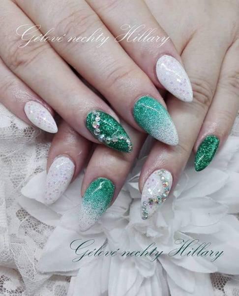 Las uñas en forma de almendra esmeralda se tocan con un poco de escarcha en las puntas. El brillo blanco hace polvo algunas de ellas mientras que pequeñas piedras preciosas dispuestas artísticamente adornan los dedos anulares. Es de notar que cada dedo de cualquiera de ellos es diferente de alguna manera de los otros.