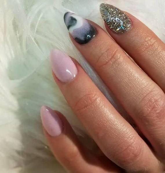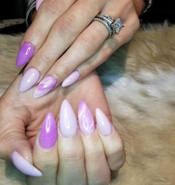 Junto con un buen humo y hecho con buen gusto, estas uñas rosadas de princesa se ven bien en la mano de todas las formas y tamaños. El punto de estilete da dramatismo mientras que los sutiles tonos rosados y el acabado brillante en las dos uñas centrales crean contraste. Este es un diseño que no es muy llamativo y es adecuado para aquellos que buscan hacer una declaración tranquila.