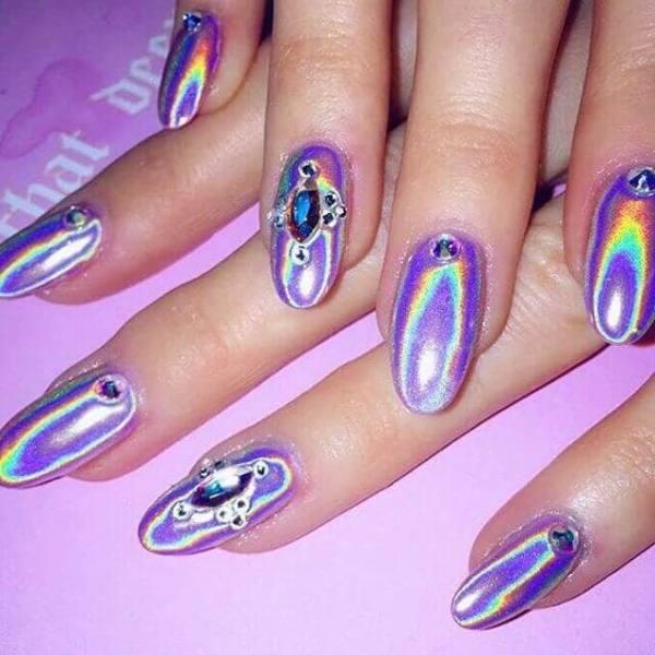 ¿Puedes tener alguna vez suficiente brillo? No hay ningún brillo real en esta idea de la uña holográfica, pero la respuesta sigue siendo un rotundo no. Uno de los pocos puntas verdaderamente metálicos de esta lista, estos puntas holográficos tienen un brillo fresco y duro que los hace destacar entre la multitud.