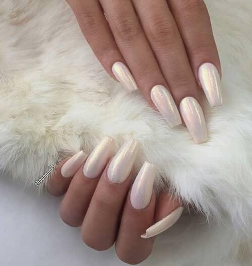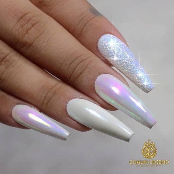 El blanco es otro color popular para el arte de las uñas con brillo, y con uñas como estas, es fácil ver por qué! El aspecto ya brillante se lleva al siguiente nivel tan pronto como llega a la luz, de modo que el aspecto brillante y reluciente es imposible de ignorar.