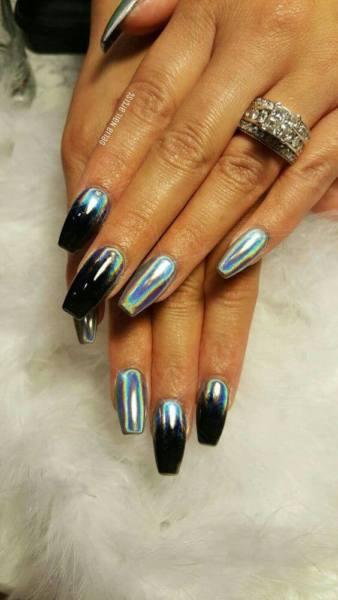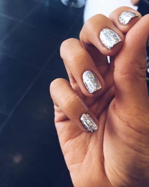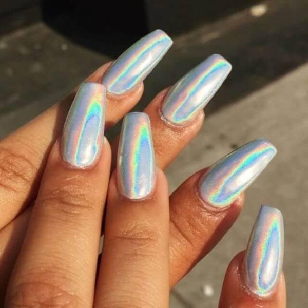 No hay necesidad de volverse loco con estas uñas limpias, pulcras y sin pretensiones, este estilo está listo para salir a la carretera, con el brillo y el glamour al máximo! Con una partícula de pigmento holográfico más visible que algunos de los otros estilos, estas uñas atrapan la luz en una furia de colores, y el resultado final es nada menos que cromo puro.