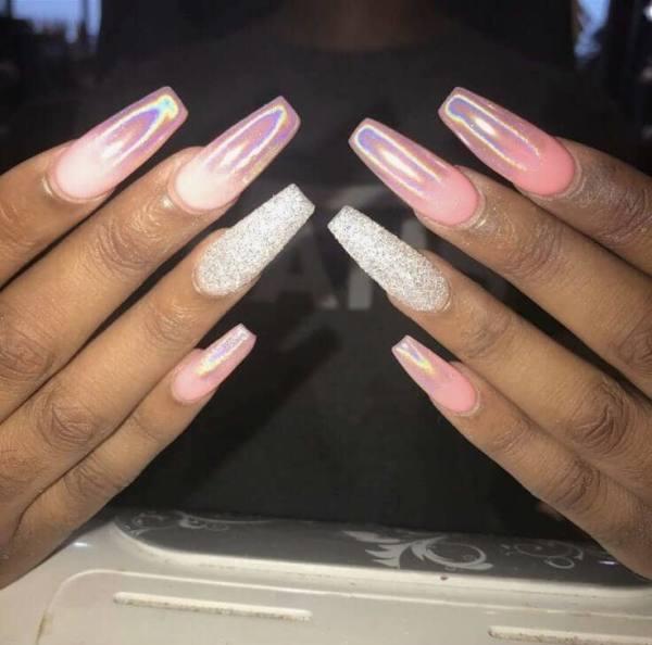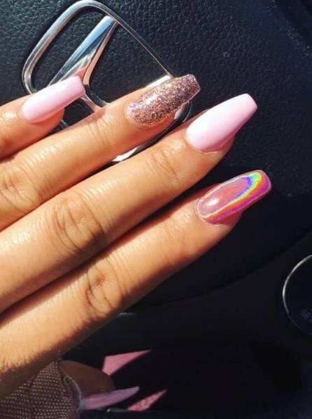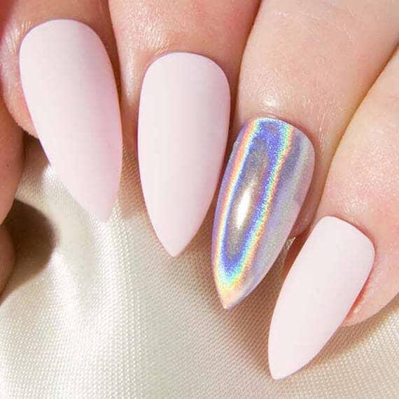 ¡Estos puntas holográficos parecen tener lo mejor de ambos mundos! El rosa suave y apagado de la mayoría de las uñas, combinado con las uñas de cromo brillante en los dedos anulares y la forma puntiaguda de cada uña individual, presentan una imagen que es a partes iguales peligro y belleza suave y femenina. También nos encanta la forma en que la uña de cromo refleja el brillo de las uñas de color rosa para recoger algunos tonos de rosa propios!