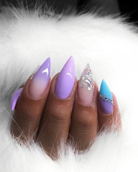 Como algunos de los otros ejemplos de esta lista, estas uñas parecen lo suficientemente afiladas como para cortar el vidrio, pero los tonos rosados y púrpuras más suaves de las uñas sin acento redondean algunos de los bordes y le dan un aspecto dulce y sensual. Se puede obtener el mismo efecto ya sea agregando strass reflectantes individuales o poniendo esmalte de uñas transparente en cuentas en la uña de contraste y fijándolo después de cada aplicación!