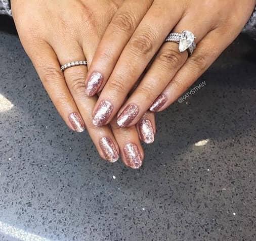 ¡Rosa! Como muchos de los otros estilos de esta página, estas uñas holográficas usan esmalte de uñas en polvo rosa para crear un aspecto cálido, amigable y familiar que sólo revela su naturaleza holográfica al examinarlas más de cerca. Como muestra este estilo, no puedes equivocarte con unos pocos anillos de moda para dirigir el foco hacia tus uñas perfectamente pulidas.