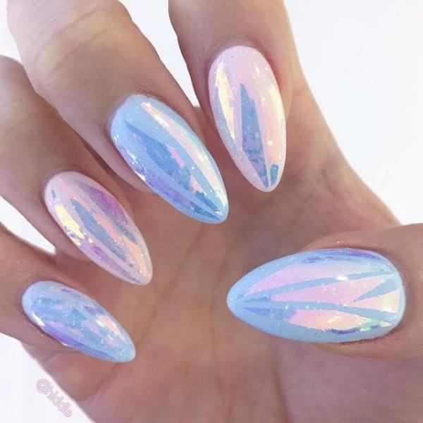 Limpias, elegantes y exactamente deslumbrantes opalescentes, estas uñas brillantes son un excelente ejemplo de lo que hace que el arte holográfico de las uñas sea tan intrigante, es decir, la forma en que interactúan con la luz y la sombra para que ninguna uña se vea exactamente igual. Aquí, los tonos rosados, plateados y azules son escogidos por la forma en que la luz las golpea, y el resultado final hace difícil mirar hacia otro lado.