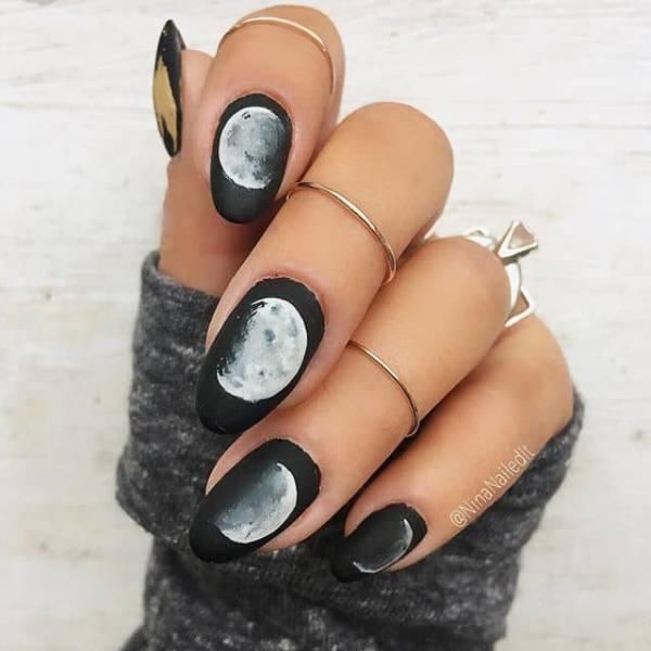 Este diseño es magnífico y único. Las uñas están pintadas de negro mate, lo que hace que las lunas pintadas en ellas brillen y se destaquen claramente. Las lunas están pintadas con tal detalle que en realidad parecen versiones en miniatura de la luna en el cielo nocturno.