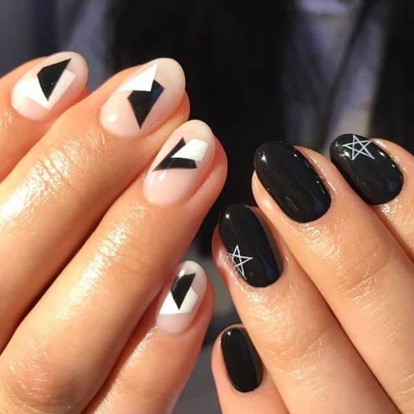Este diseño tiene un aspecto separado para cada mano, y ambas manos están súper limpias. Una mano tiene una uña natural con estos frescos patrones geométricos en blanco y negro. La otra mano está cubierta de esmalte negro con estrellas blancas de cinco puntas como las que se ven en todas las películas de Halloween o de terror que se han hecho. Son un elemento básico del género de las cosas de miedo, y se ven muy bien en las uñas para Halloween.