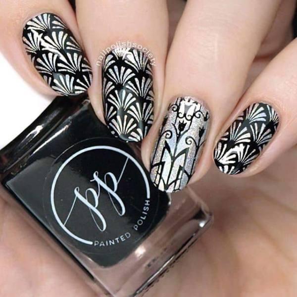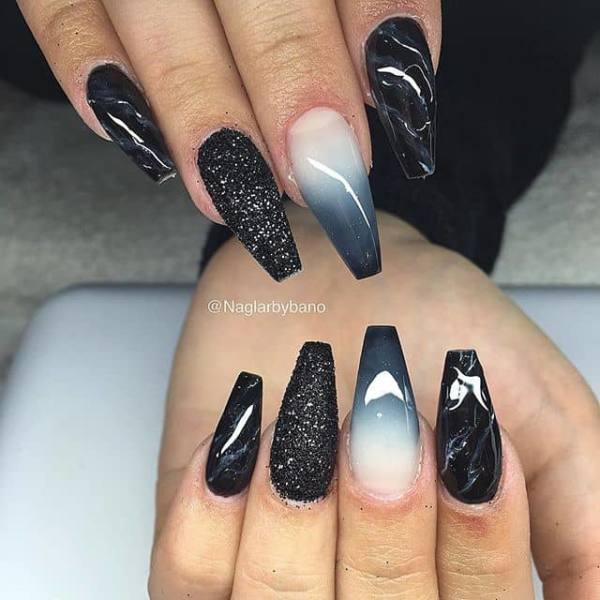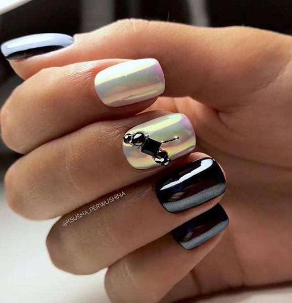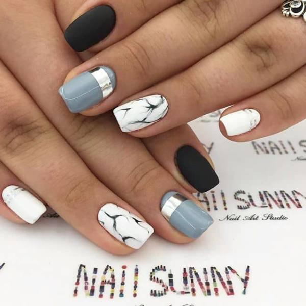 Estas uñas son geniales para la belleza práctica y cotidiana. Las uñas de los dedos medios están hechas en gris con bandas de plata a lo largo de ellas. Se ve absolutamente impresionante. Hay bandas plateadas similares a través de las uñas meñiques blancas, también. Los dedos índices son de un negro brillante, y los anulares son de un blanco marmolado. Juntos, estas uñas tienen un aspecto fantástico.