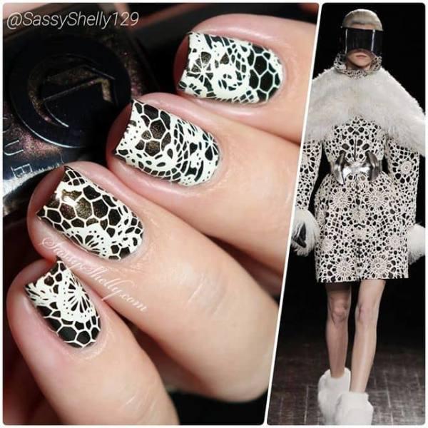 Estas uñas son hermosas, blancas y negras, de punta cuadrada, pintadas para que parezcan como si las uñas de la portadora estuvieran cubiertas de intrincados adornos de encaje. La capa base de las uñas es negra, y la blanca está pintada de tal manera que realmente parece que las uñas están cubiertas de encaje. Son realmente únicas.
