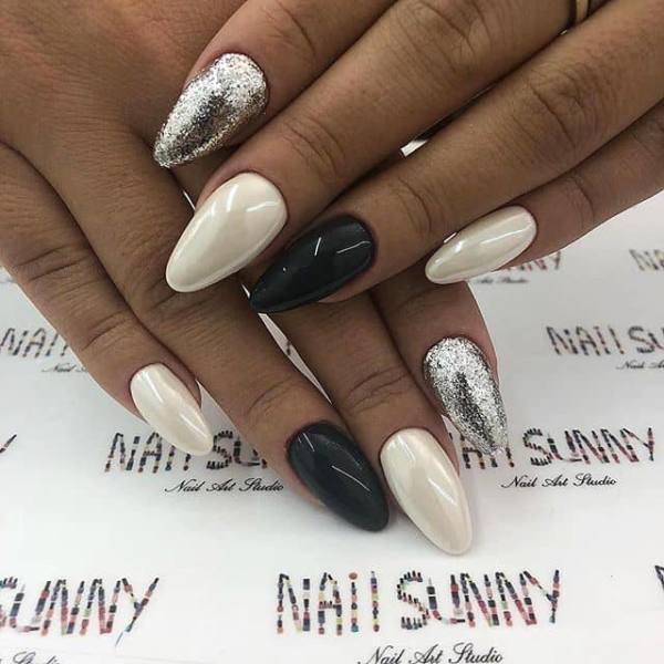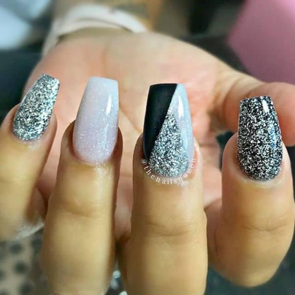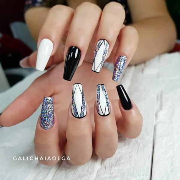 Este diseño es para aquellos que buscan un aspecto más formal y notorio. Son una mezcla de uñas simples, de color sólido blanco y negro, con mucho brillo plateado y un gran número de acentos. Este es un magnífico diseño que complementará su ropa de noche espléndidamente, y el brillo plateado le da un aspecto muy invernal.