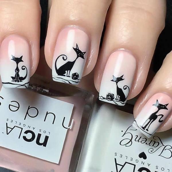 El arte de las uñas de estos puntas es uno de mis diseños favoritos. Cada uña está hecha en un color de base blanco natural y tiene un gato negro muy guay. Los gatos son tan lindos como espeluznantes, lo que hace que estas uñas sean perfectas para Halloween. Además, los gatos son los mejores animales del mundo, así que literalmente, todos deberían llevarlos en las uñas todo el tiempo.