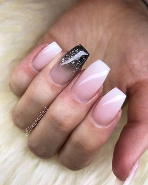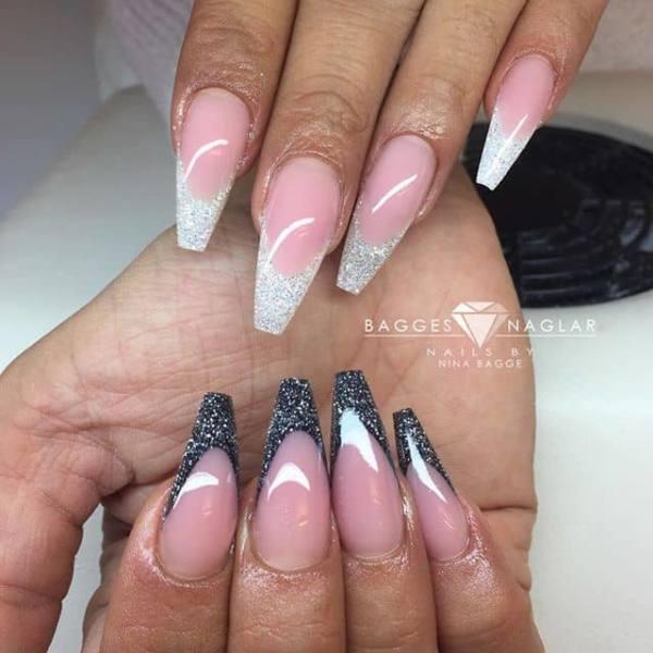 Estas elegantes uñas tienen forma de bailarina con una base natural. Las puntas, sin embargo, están hechas con una extravagancia chispeante, con una mano hecha en destellos negros y la otra mano hecha en destellos blancos. Se ven especialmente sorprendentes cuando la luz las golpea y las hace brillar.