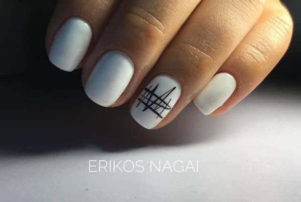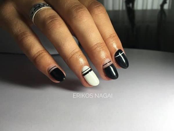 Estas uñas son en su mayoría negras, con la excepción de una uña blanca en el dedo anular de cada mano. Cada uña tiene rayas de diferente tamaño, ya sea en color natural, blanco o negro. Son simples, fáciles de crear, e increíblemente bonitas.