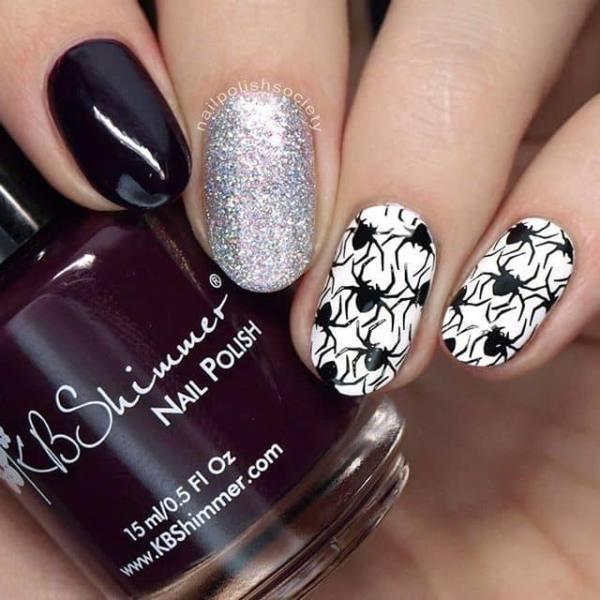 Estas uñas blancas y negras son otras de mis favoritas. Una de las uñas de cada mano está pintada con una capa de pintura plateada brillante, una es negra brillante, y las otras dos uñas de cada mano tienen una base blanca con un patrón de arañas negras por todas partes. Son súper lindas y muy divertidas.