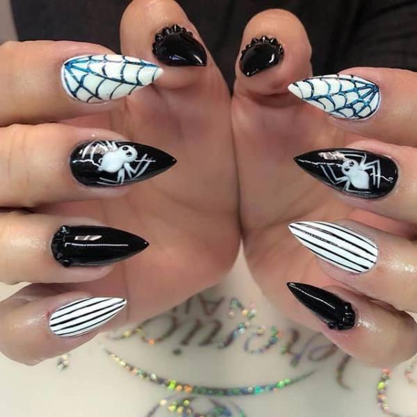 Si te gustan las uñas con mucho movimiento, te encantarán estas uñas blancas y negras. Las uñas de los dedos del medio son negras con una araña blanca pícara sobre ellas; los dedos índices son blancos con brillantes telarañas que las atraviesan; y los dedos anular y meñique son blancos con rayas negras o negras con puntos tridimensionales en forma de garras en sus bases, dependiendo de la mano en la que se encuentren. Son unas uñas absolutamente increíbles.