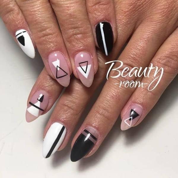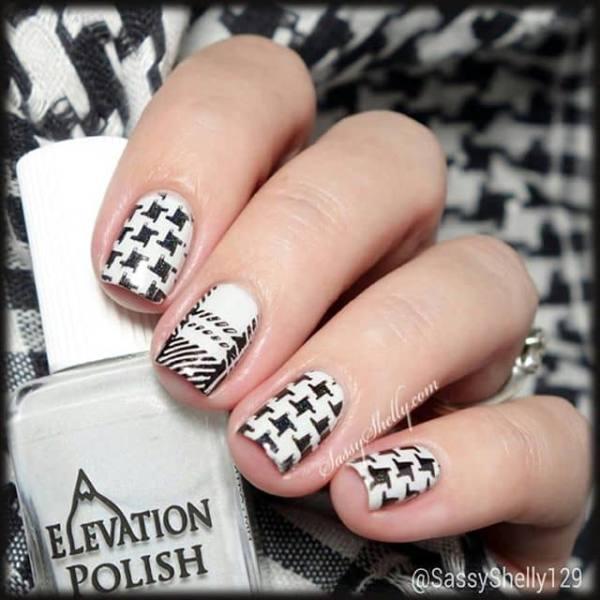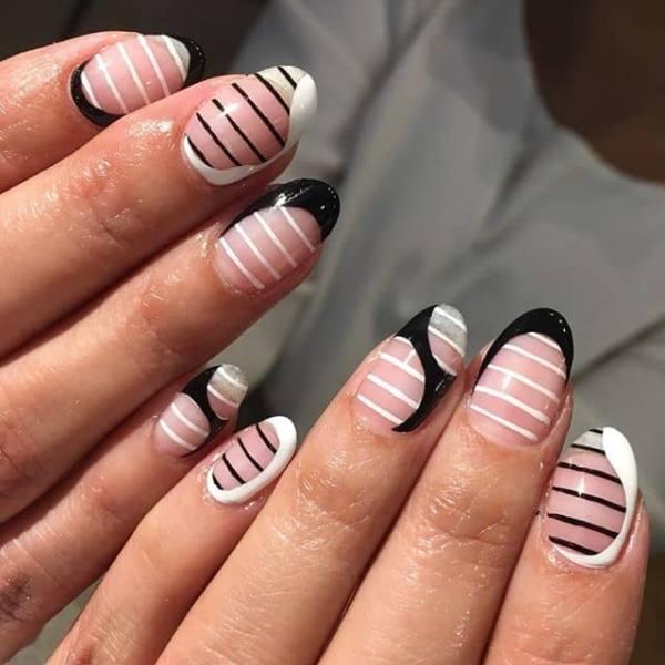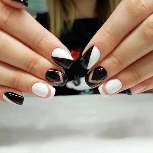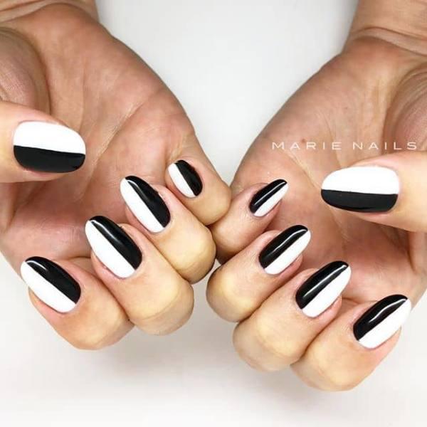 Estas uñas son una mezcla de blanco y negro en toda la mano. Algunas uñas están hechas mitad en negro y mitad en blanco, partidas diagonalmente por la mitad. Otras son de color negro sólido con las uñas de color natural en el medio. Otras son blancas con líneas claras y curvas. Cada uña es diferente, pero cada uña también es única y está de moda.