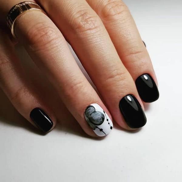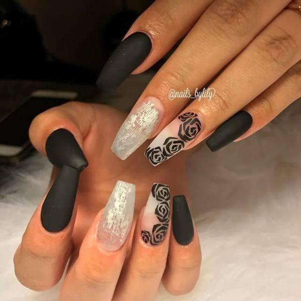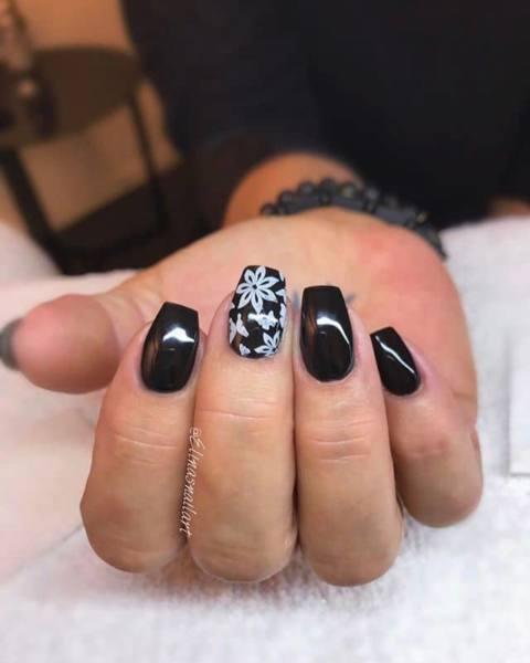 El color predominante en este diseño de manicura en particular es el negro; de hecho, cuatro de las cinco uñas de cada mano están hechas en negro sólido que tiene un ligero brillo. El dedo anular de cada mano, sin embargo, es blanco con una delicada e intrincada flor pintada en negro y gris. Es un diseño muy chic y elegante que se ve muy bien en cualquier persona y con cualquier traje.