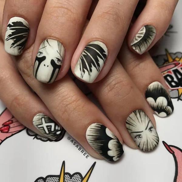 Si te gusta el anime japonés o el manga, estos son definitivamente los puntas para ti. Estas uñas tienen una base blanca mate, pero el arte en cada uña es tan intrincado y detallado, que parece que alguien las sacó directamente de las páginas de una novela gráfica. Hay caras, kanjis, flores y otros diseños, y cada uno de ellos es simplemente hermoso.