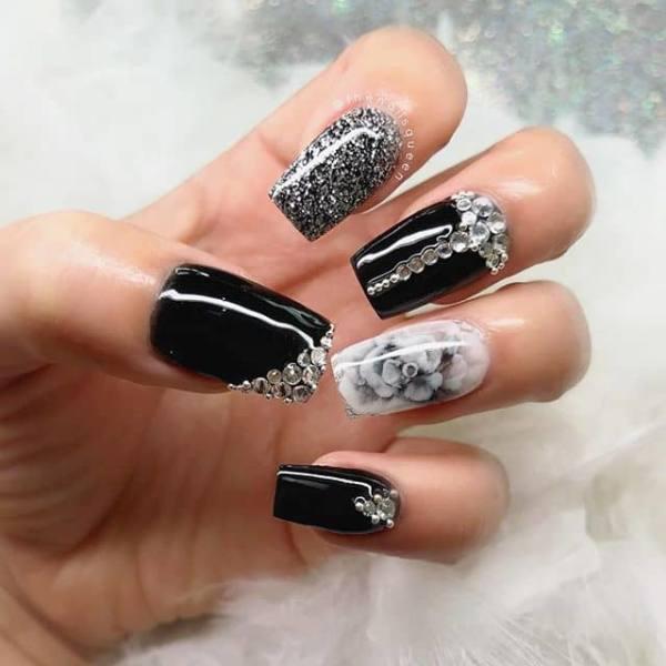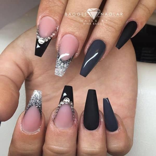 Este diseño utiliza la belleza de sus propias uñas naturales mezcladas con un sólido y profundo negro. Las dos últimas uñas están hechas en negro sólido, mientras que los dos primeros dedos muestran la uña natural, rodeada de diamantes falsos en un dedo y una salpicadura de plata brillante en el otro. Es una magnífica elección para combinar con su pequeño vestido negro para una noche en la ciudad.