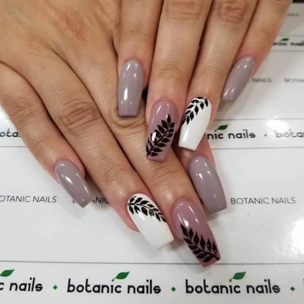 A excepción de las uñas del dedo anular de cada mano, estas uñas están hechas en un color beige grisáceo. Las uñas de los dedos anulares, sin embargo, están hechas de un blanco brillante. Los dos dedos del medio de cada mano tienen bonitos helechos negros estampados en ellos, y se ven absolutamente asombrosos. Las puntas cuadradas de las uñas simplemente añaden el aplomo y la gracia de las ya impresionantes uñas.